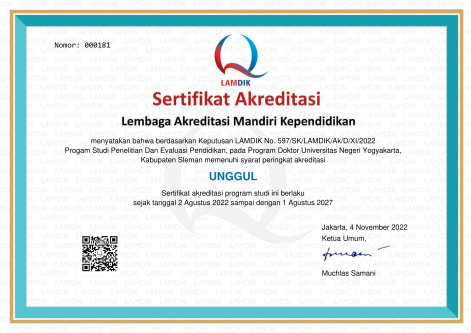 S3 Pendidikan dan Evaluasi Pendidikan UNY meraih Akreditasi Unggul berdasarkan keputusan LAMDIK No. 597/SK/LAMDIK/Ak/D/XI/2022