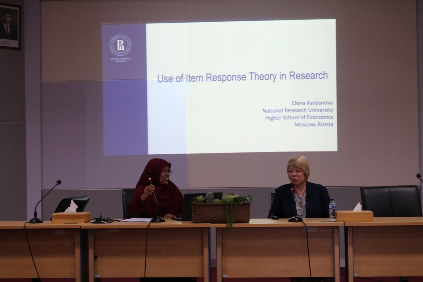 Ia juga membagikan berbagai penelitian yang telah dilakukannya terkait dengan penggunaan IRT, khususnya dalam konteks Rusia. Elena menekankan bahwa tren pengukuran pendidikan modern saat ini berpusat pada pengukuran kemajuan belajar peserta didik, keterampilan kompleks abad 21, integrasi teknologi dalam asesmen, dan peningkatan kualitas instrumen pengukuran melalui IRT. Menurutnya, IRT memiliki keunggulan dibandingkan teori tes klasik, seperti parameter kemampuan peserta tes yang tidak bergantung pada tes dan parameter butir yang tidak tergantung pada sampel.
